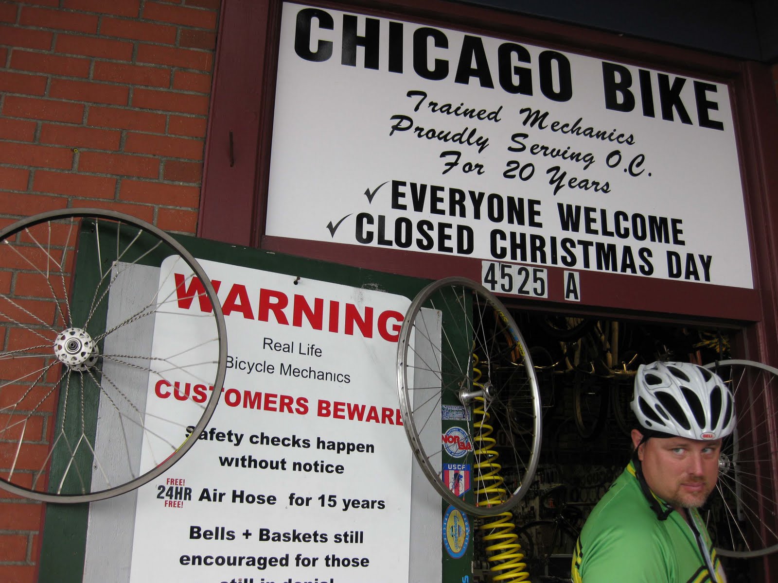 On the way back we sped past a rider standing on the sidewalk and by the looks of it he wasn't there for the scenery or to take a breather. As we past him, I could see a long skinny steel tail trailing from his rear wheel, a busted chain! We kept on riding and I my mind went wild with inner communication, "That sucks, I have all the tools to help him and yet I kept on riding past. I should stop and turn around. Wouldn't I want someone to lend a helping hand if I was stuck. I wonder where he's riding from?" I yelled to Michael and said, "I can't do it, I need to turn around and help our fellow rider." I met up with the downed rider and offered my help. I was right, his chain was busted. We mended his chain and headed to Chicago Bikes.